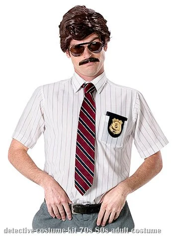 WigMustacheSunglassesBadge w/HolderYou’ll crack the case in this 70s detective costume kit! The funny set includes a pair of dark sunglasses, a brown mustache with self adhesive on the back, a silver embroidered badge with holder and a brown signature wig. The wig is lined with mesh and elastic on the interior for a secure and comfortable fit. (Please note the badge is silver and embroidered which varies from the picture.) An inexpensive and funny police costume!