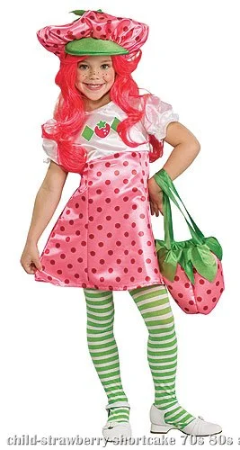 DressStockingsHatGet ready for a trip to the Berry Bake Shoppe this Halloween in our child Strawberry Shortcake costume. The girl’s costume includes a white, pink, and dark pink polyester polka dot dress, a polka dot hat, and sparkly green and white striped stockings. The top of the dress features a strawberry design over the chest, puffy capped sleeves with elastic, Velcro closure behind the neck and a bright pink skirt with fuchsia polka dots and the same strawberry design on the bottom right of the skirt. The matching hat has a green foam brim with a white ribbon decoration and a strawberry leaf decorates the top. The hat has elastic for a custom fit. Join Huckleberry Pie and Apple Dumplin’ this Halloween for a trick or treat trip your neighbor’s Berry Happy Home!