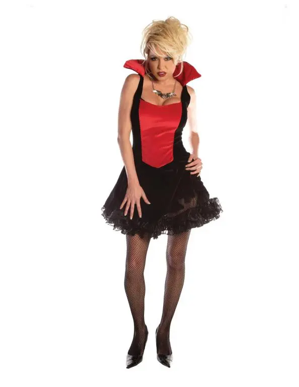 Costume includes: Black and red halter top mini dress with attached stand up collar.
