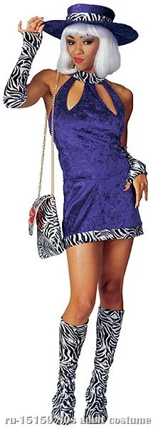 Sure to keep the fellas in check in this loudly colored Lady Pimp Costume. This Mrs. Jones Pimp Adult Costume includes a sexy purple velvet dress with zebra trim, zebra print glovelets and boot covers. You are sure to be known styling at your next 70s costume party in this lady pimp costume.