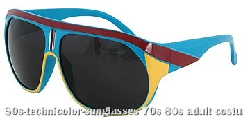 Multi-Colored SunglassesGet a totally rad 80s look with these technicolor sunglasses! The over-sized, glasses are blue and made from plastic. They feature maroon and yellow accents along the sides and in the front and have dark, round lens. Slip these glasses on with your 80s costume or for everyday wear!