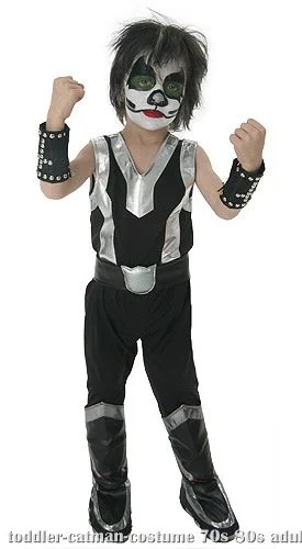 ShirtPantsBeltBoot CoversArm BandsThe legend lives and your toddler will look cool in this KISS Catman Costume. The child’s costume consists of a black spandex shirt with cut-off sleeves and silver trim. The matching black pants with an elastic waist are also included. In addition, a pair of black pleather arm bands features silver studs and a Velcro closure. The included black belt wraps around the waist and has a cat-shaped center. The costume is also includes the black and silver boot covers which have fitting elastic. Get this kids KISS costume for your little rock star this Halloween.