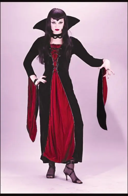 Sexy ‘Fang-Tastic’ Victorian VampiressCostume includes: Floor length, lace-up velvet gown in black and red with gold trim, draped sleeves, and stand up collar with attached choker.Available size:
